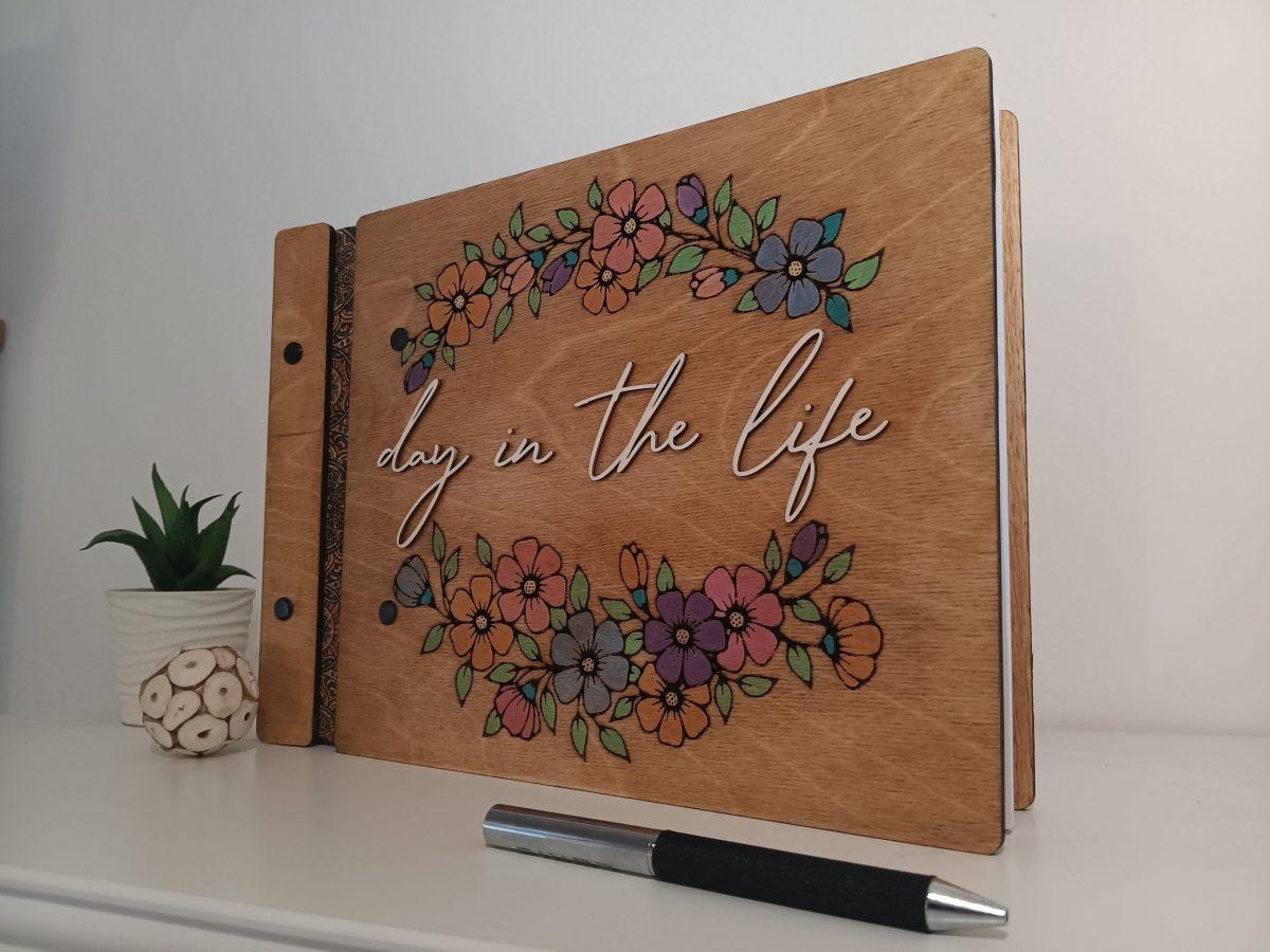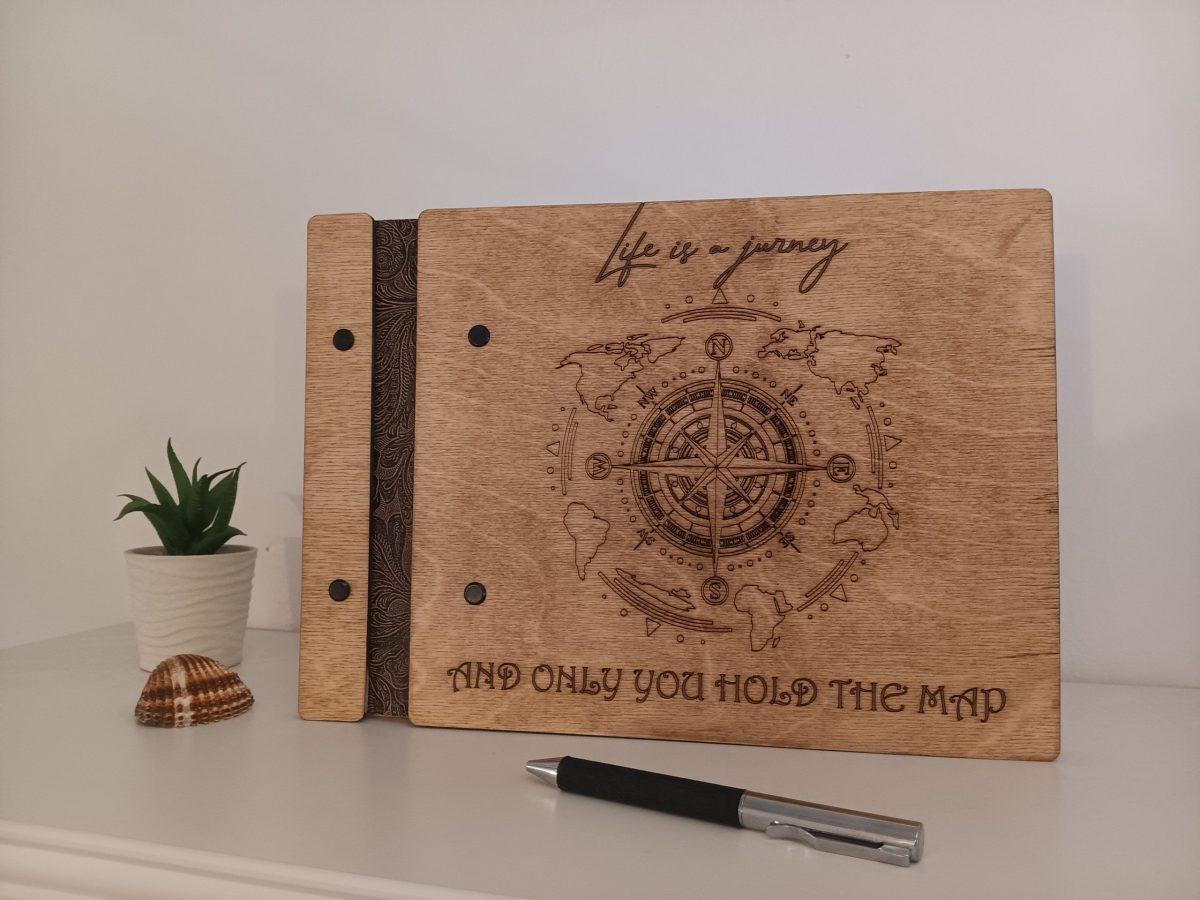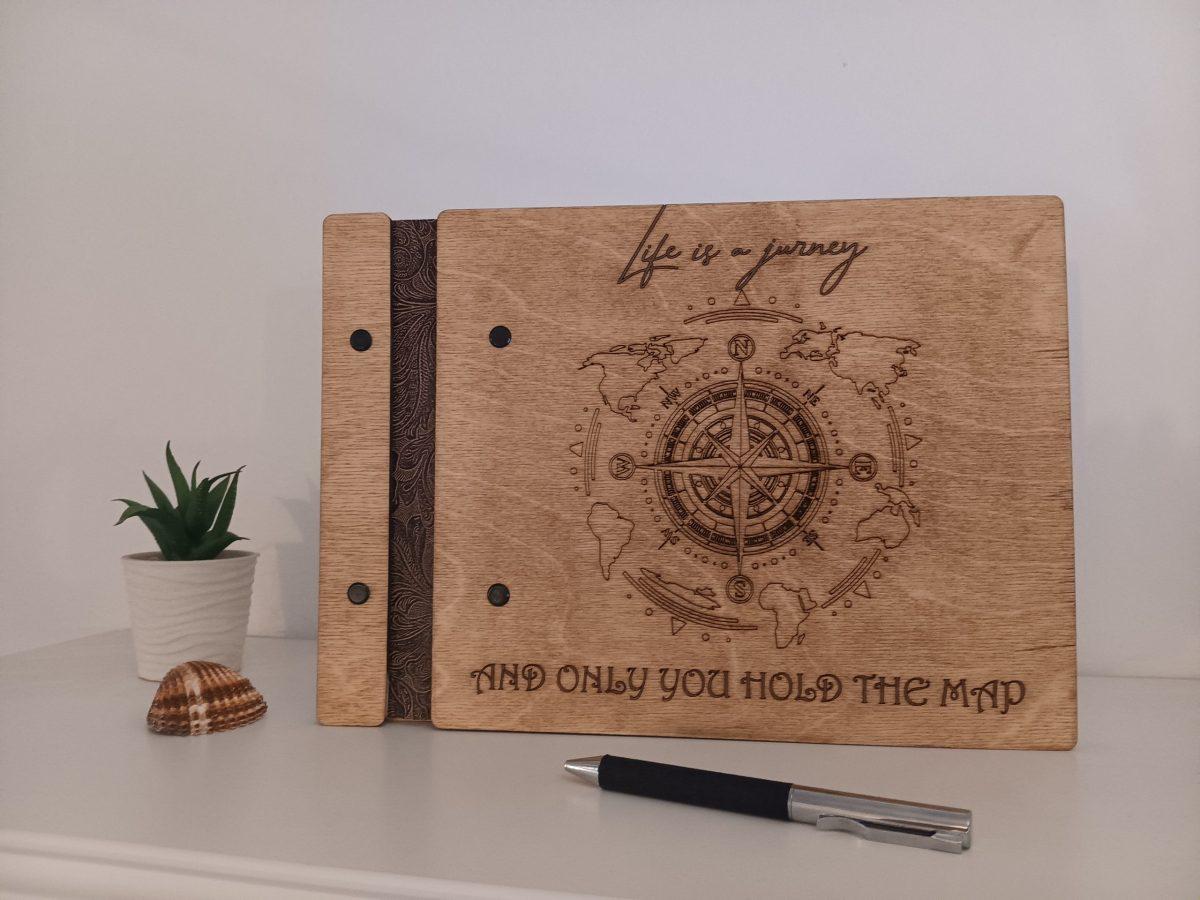 Leseni dnevnik z graviranim motivom in usnjeno vezavo. Na voljo v velikosti 30 × 21,5 cm, s 50 listi. Možnost personalizacije – ime, citat ali motiv. Popolno unikatno darilo.