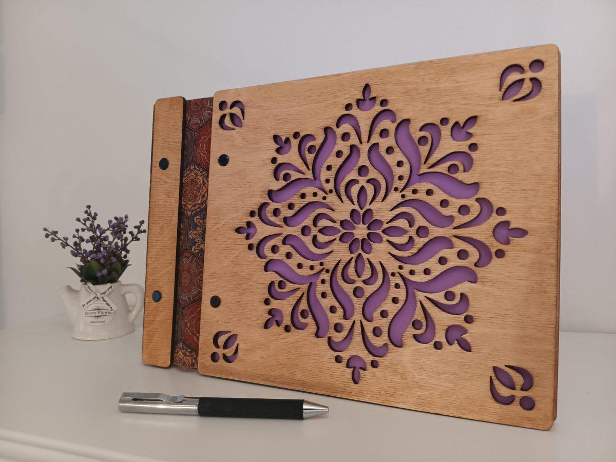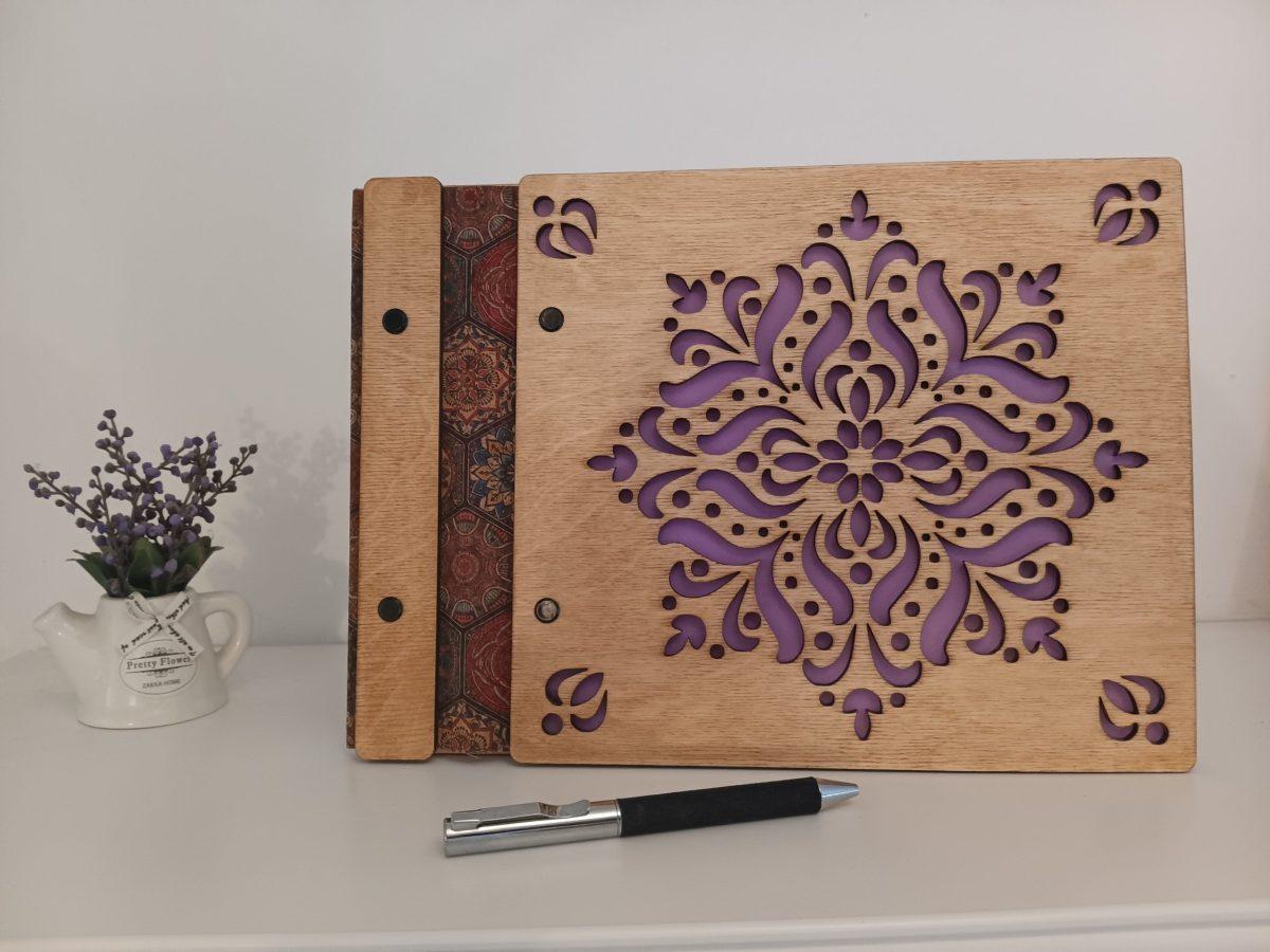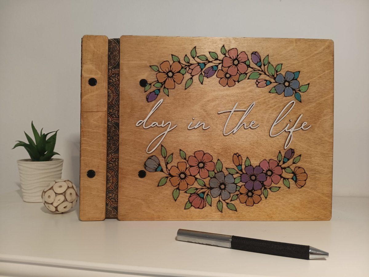 Leseni dnevnik z graviranim motivom in usnjeno vezavo. Na voljo v velikosti 30 × 21,5 cm, s 50 listi. Možnost personalizacije – ime, citat ali motiv. Popolno unikatno darilo.